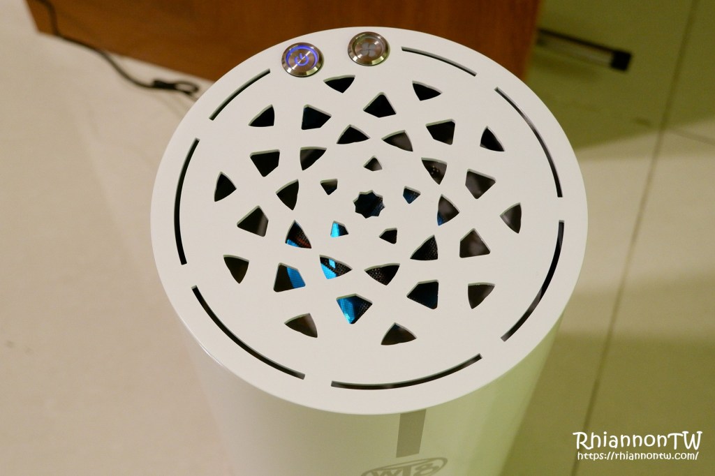 (這WETOP R1S全方位環境淨化空氣抑菌機運轉時的淡藍色燈光,因為很微弱不刺眼,同時又在底部的位置,所以像這樣放在房間可以當作小夜燈,但又比小夜燈暗,