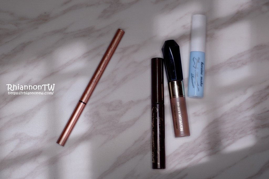 由左至右依序是本次主要分享的花漾美姬勾勒美瞳柔滑眼線膠筆,還有睫毛底膏、染眉膏以及睫毛卸除液